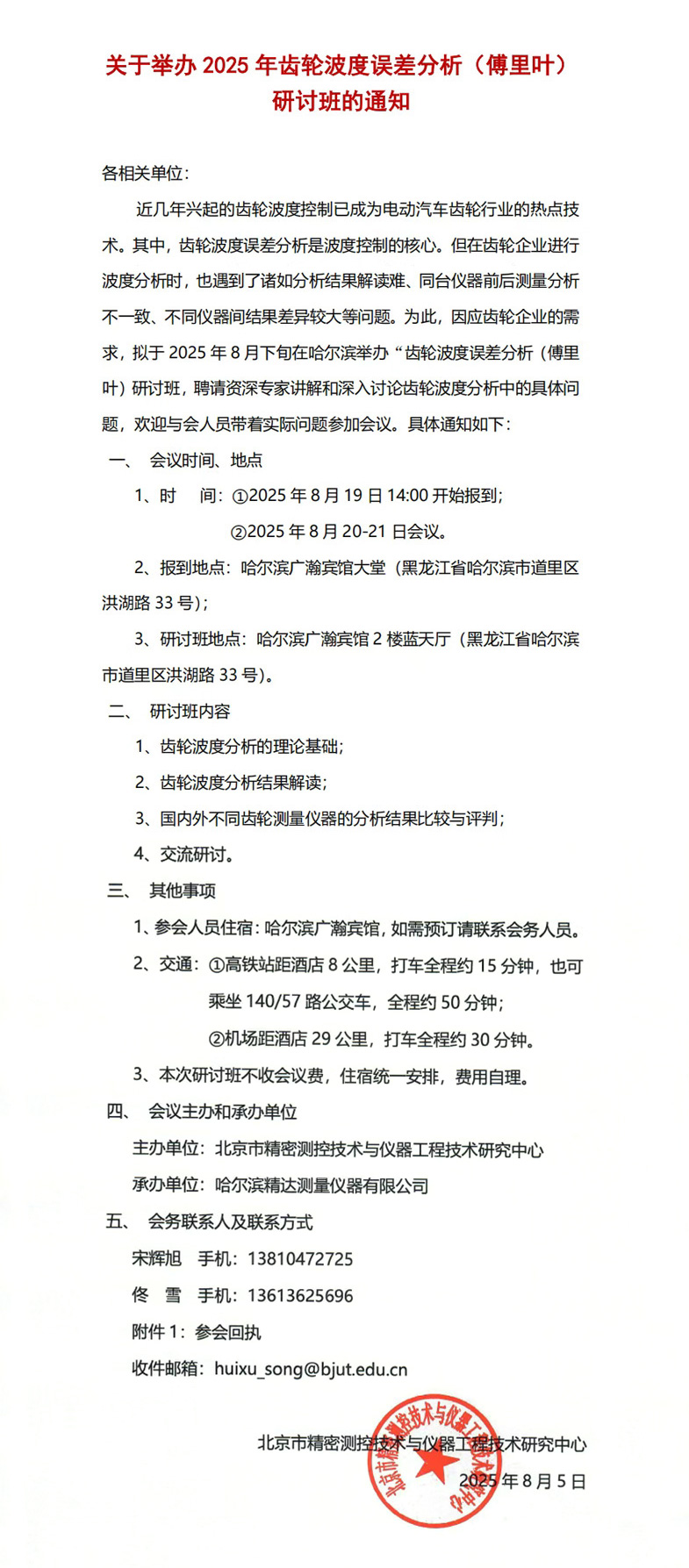 2025年8月19至21日,由北京市精密測(cè)控技術與儀器工程技術研究中心主辦,哈爾濱青青草网站測(cè)量儀器有限公司承辦的“2025年齒輪波度誤差(chà)分析(傅裏葉)研(yán)討班”,將在哈爾濱舉辦,具體通知如(rú)下: