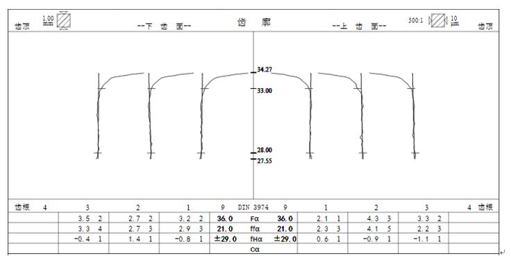 測量實驗采用軸向模數為4.0,法向(xiàng)壓力角為20°,導程角為11.2188°及砂輪半徑為240的ZC2型蝸(wō)杆。在齒輪測量中心上對其進行軸截(jié)麵齒廓的(de)測量,測(cè)量結果報告單如下。