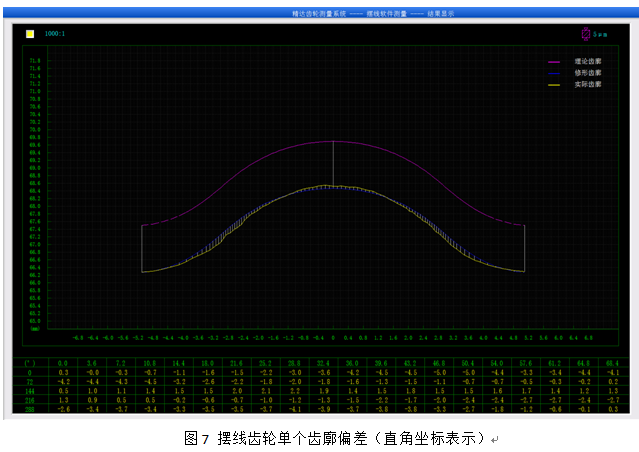 以上第一種齒廓表達形式,在誤差曲線長度方向是擺線的等距齧合角度,反應的是擺線齒(chǐ)輪的齧合特性,而(ér)後一種齒廓表達形式,是轉化成直角坐標,清晰表達理論齒廓,設計齒廓及測(cè)量實際誤差曲線的關係,更緊密結合CAD數字化設(shè)計製造的評判。