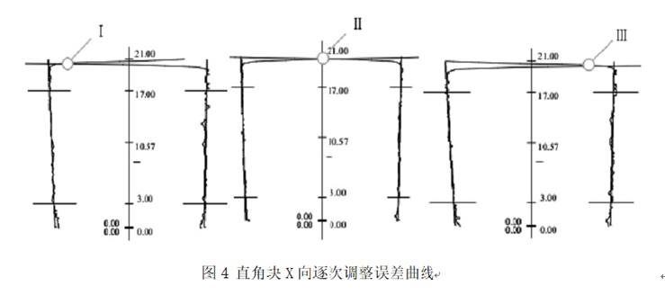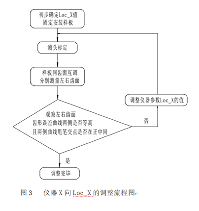 循(xún)環以上過程,根據調整完成的直角塊位(wèi)置坐標重新標定後,再次進行測量,調整,對於有經驗的操作人員,經過幾次(cì)循環很快就會得到滿足儀器X向坐標精度要求的直角塊在儀器X向(xiàng)的(de)坐標(biāo)位置。圖3是儀器X向調整流程圖,圖4是(shì)調(diào)整直角塊(kuài)X坐標得到的齒形誤差曲線。