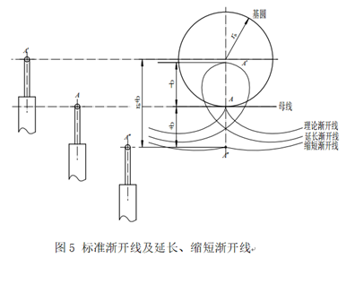 根據漸開線的展(zhǎn)成原理,在(zài)基圓(yuán)內(nèi)的一點,隨(suí)著漸開線的展成形成的軌跡(jì)叫做“延(yán)長漸開線(xiàn)”,而基圓外的一點形成的軌跡是“縮(suō)短漸開線”,無論“延長漸開(kāi)線”,還是“縮短漸(jiàn)開線”與基準漸開線相(xiàng)比較,其在漸(jiàn)開線的起始位置也即齒輪的根部位置(zhì),會(huì)造成比較明顯的大誤差,而隨著(zhe)漸開線的展開,誤差會逐漸減小,如圖5所示。